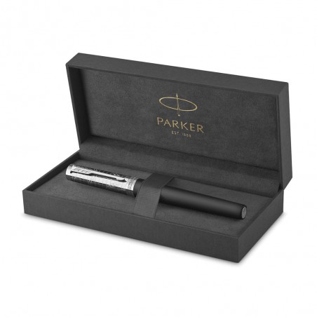 Nasadka pełni w tym modelu rolę kluczowego elementu stylistycznego. Połączenie gładkiej, polerowanej stali z delikatnym, technicznym wzorem tworzy efekt elegancji o nowoczesnym charakterze. Klips w kształcie strzały, będący rozpoznawalnym symbolem marki Parker, dopełnia projekt i stanowi czytelne nawiązanie do tradycji marki.