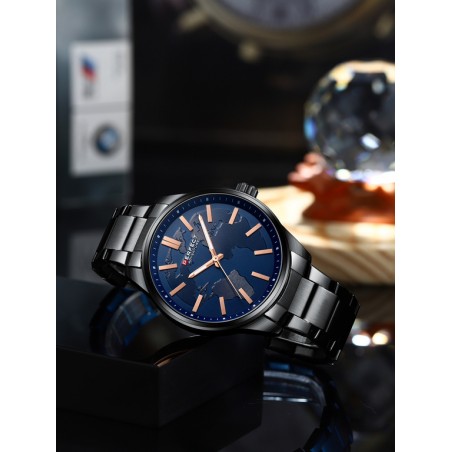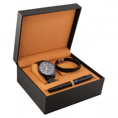 W zestawie znalazły się klasyczne, piękne spinki do koszuli. Jeśli masz pewność, że pan dla którego szukasz prezentu uwielbia tego typu biżuterię, koniecznie sięgnij po zestaw ze spinkami. Będą one piękną ozdobą koszuli. Niebieski kolor oraz ciekawy kształt sprawiają, że spinki prezentują się wprost nieprzeciętnie. Do zestawu dołączono pióro Parker IM w klasycznym i bardzo eleganckim wydaniu. Niebieskie pióro prezentuje się szalenie stylowo i wytwornie. Dopełnieniem zestawu jest zegarek Perfect, który posiada swój niepowtarzalny styl. Niebieska tarcza świetnie kontrastuje z czarną bransoletą. To zegarek dla mężczyzn ceniących wysoką jakość oraz stawiających na klasykę.
